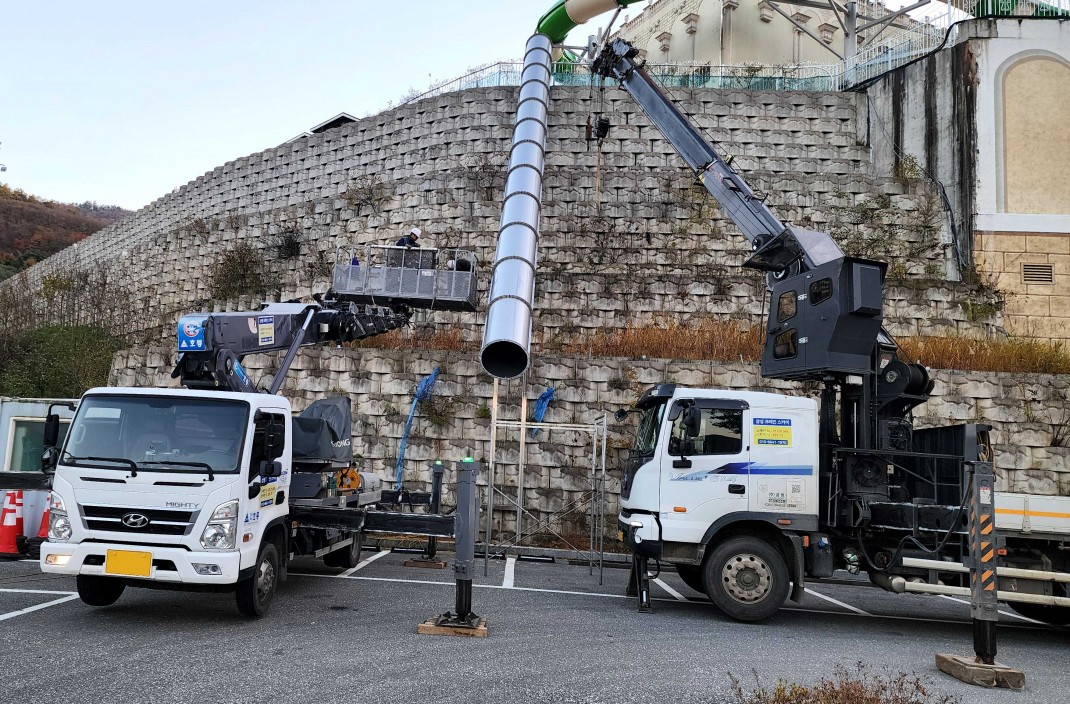 이번에는 쓰레기 처리용 대형 설비를 새로 제작해 설치하는 작업이었는데요, 이 작업에는 사북크레인과 스카이차량이 함께 투입되어 완벽한 협업을 보여주었습니다.