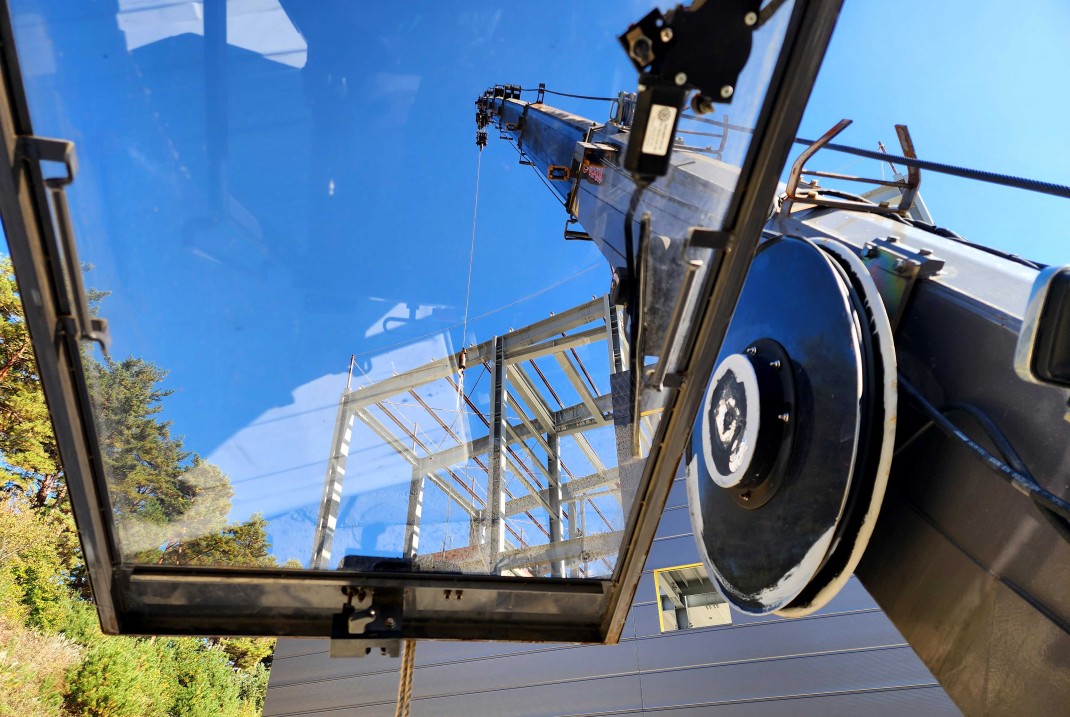 사진에서 보이듯, 크레인 운전석에서 올려다본 구조물과 푸른 하늘, 그리고 조심스럽게 인양되는 자재들은